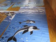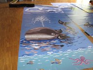 Dank einer Stoffballenspende hatten wir das Grundmaterial. Die Idee war, das Bühnenbild modular anzulegen, damit wir es den verschiedenen Auftrittsorten anpassen können. Zuerst wurde der Stoff zugeschnitten, dann gewaschen und um gesäumt. Das Bühnenbild ist in mehrere Bahnen aufgeteilt und insgesamt 12 Meter lang. Wo finden wir einen Ort, an dem wir den Stoff liegend bemalen können? Es war nicht einfach einen solchen Ort zu finden. Dank der guten Beziehung der Künstlerin zum Blumengroßhandel in Mannheim konnten wir am Wochenende einen Teil der Halle benutzen. Danke.